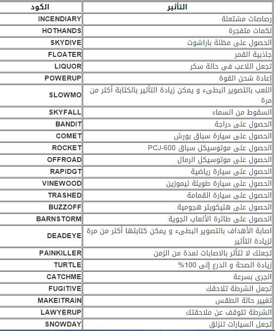 كلمات سر لعبة Gta كاااملة وكل شيفراتها